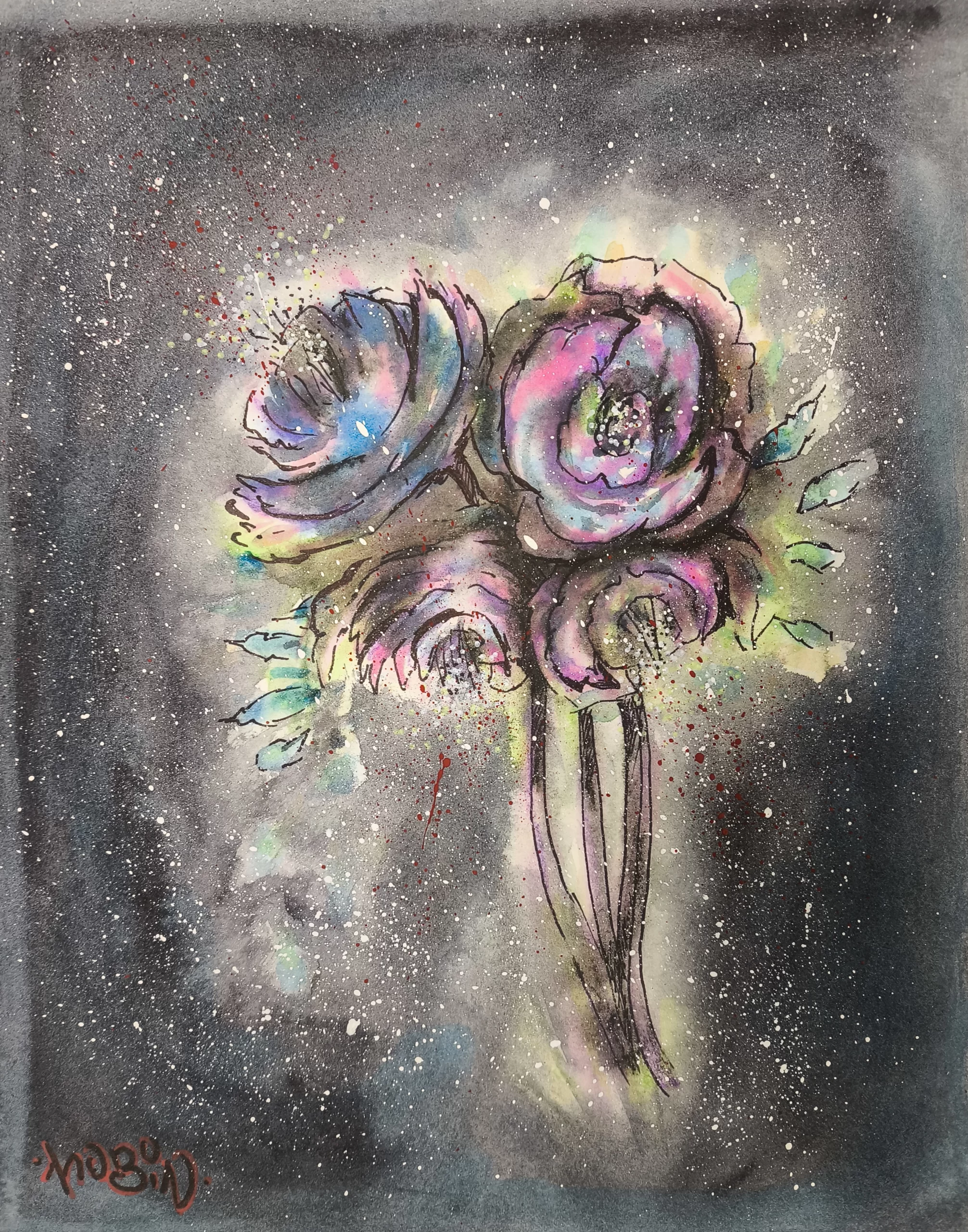 Las formas florales se construyen con una paleta audaz y un trazo libre. El rosa intenso, el azul eléctrico y los destellos amarillos se superponen y se mezclan, confiriendo a los pétalos una cualidad casi iridiscente. Este manejo cromático, con su estilo pictórico vibrante, transmite una frescura sorprendente; las flores no están estáticas, sino que parecen girar lentamente, como cuerpos celestes recién formados.