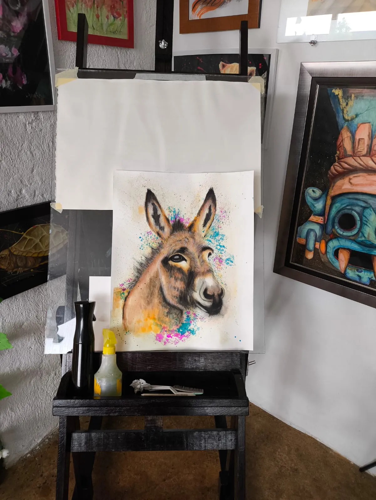Retrato de un burro gris sobre un fondo colorido, que captura la nobleza y simpatía de un animal entrañable. Esta pieza, pensada para un entorno rústico y acogedor, rinde homenaje a un miembro muy querido del hogar.