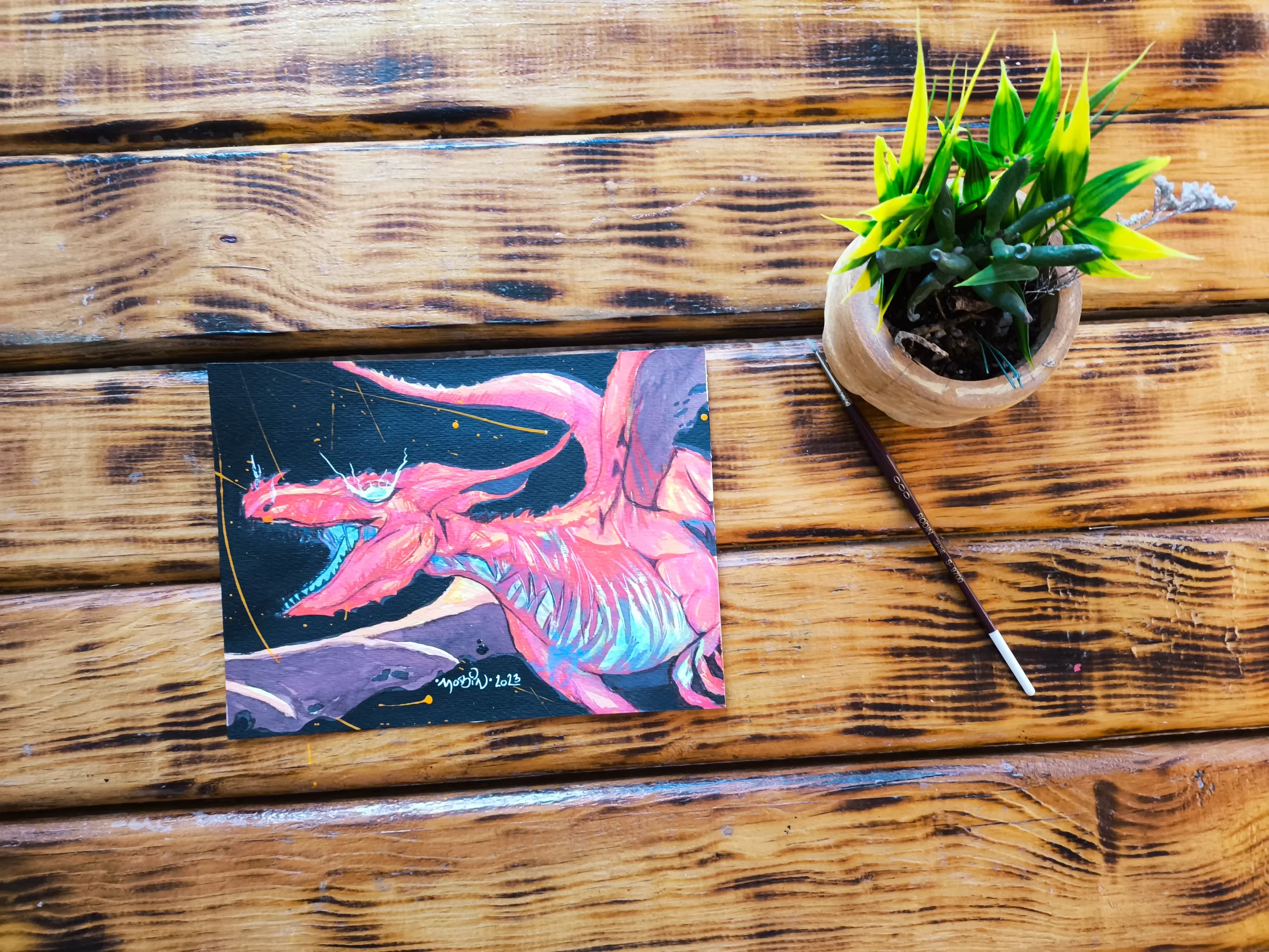 El espectador queda atrapado entre el asombro y la tensión, enfrentando el poder de una criatura fantástica que encarna tanto la belleza salvaje como la amenaza inminente. Esta pieza no solo representa a un ser mítico, sino también el arrebato emocional de un poder indomable, imposible de ignorar. La escena, construida con fuerza cromática y detalles feroces, deja una impresión tan ardiente como la criatura que retrata.