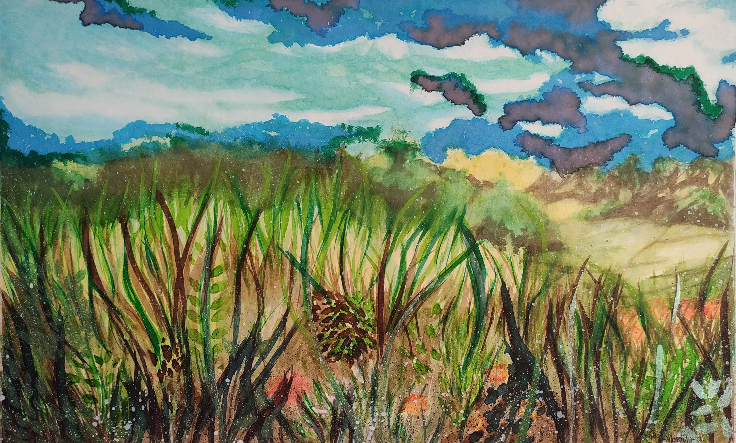 Cada elemento del cuadro respira armonía: el movimiento sutil del pasto, la luz cálida que baña las flores y la amplitud del cielo sugieren un instante detenido en el tiempo. La obra despierta una sensación de calma y asombro, invitando a reconectar con lo simple, con la belleza natural que a menudo pasa desapercibida. Aquí, lo cotidiano se convierte en mágico, y el paisaje deja de ser solo un fondo para convertirse en protagonista de una historia sin palabras.