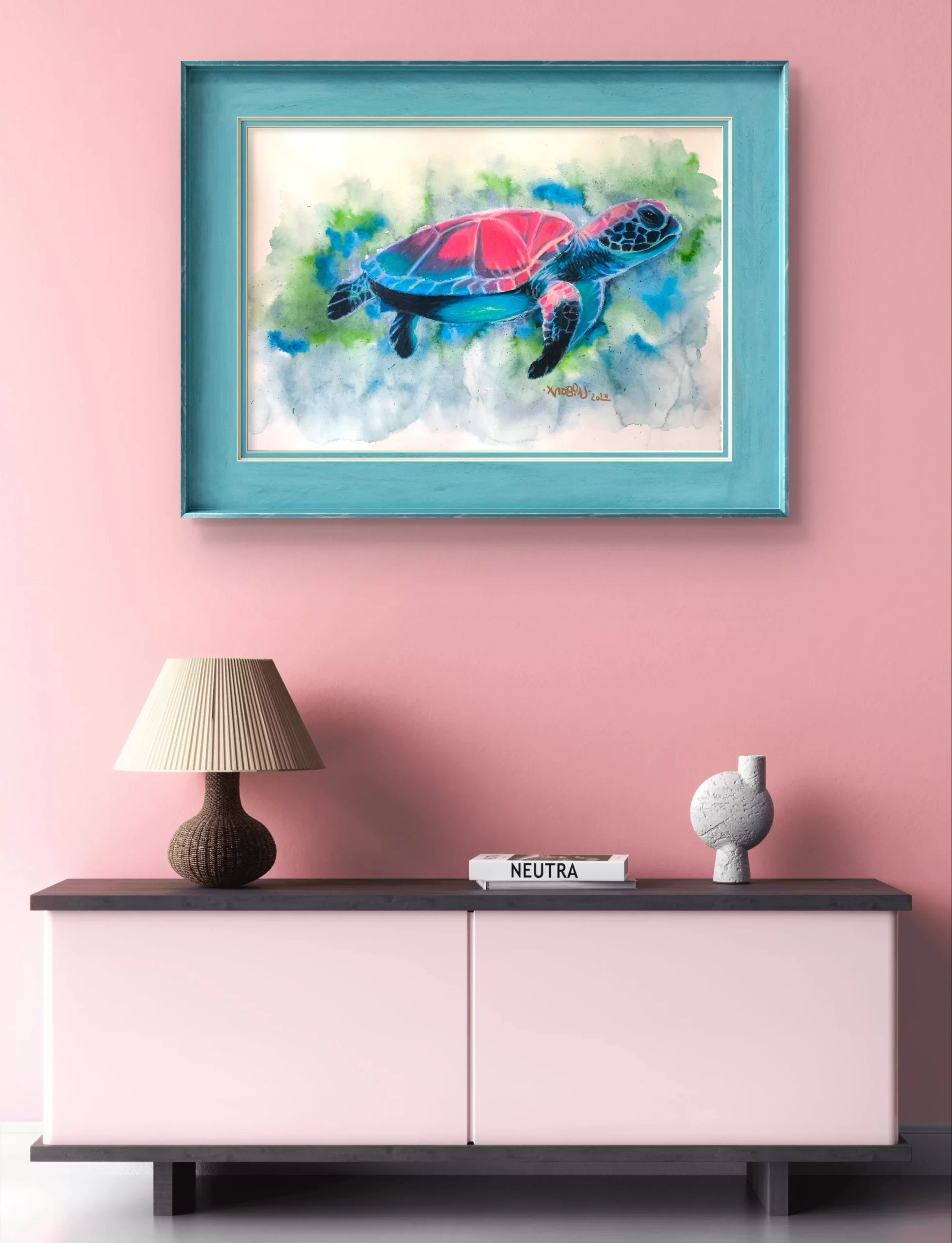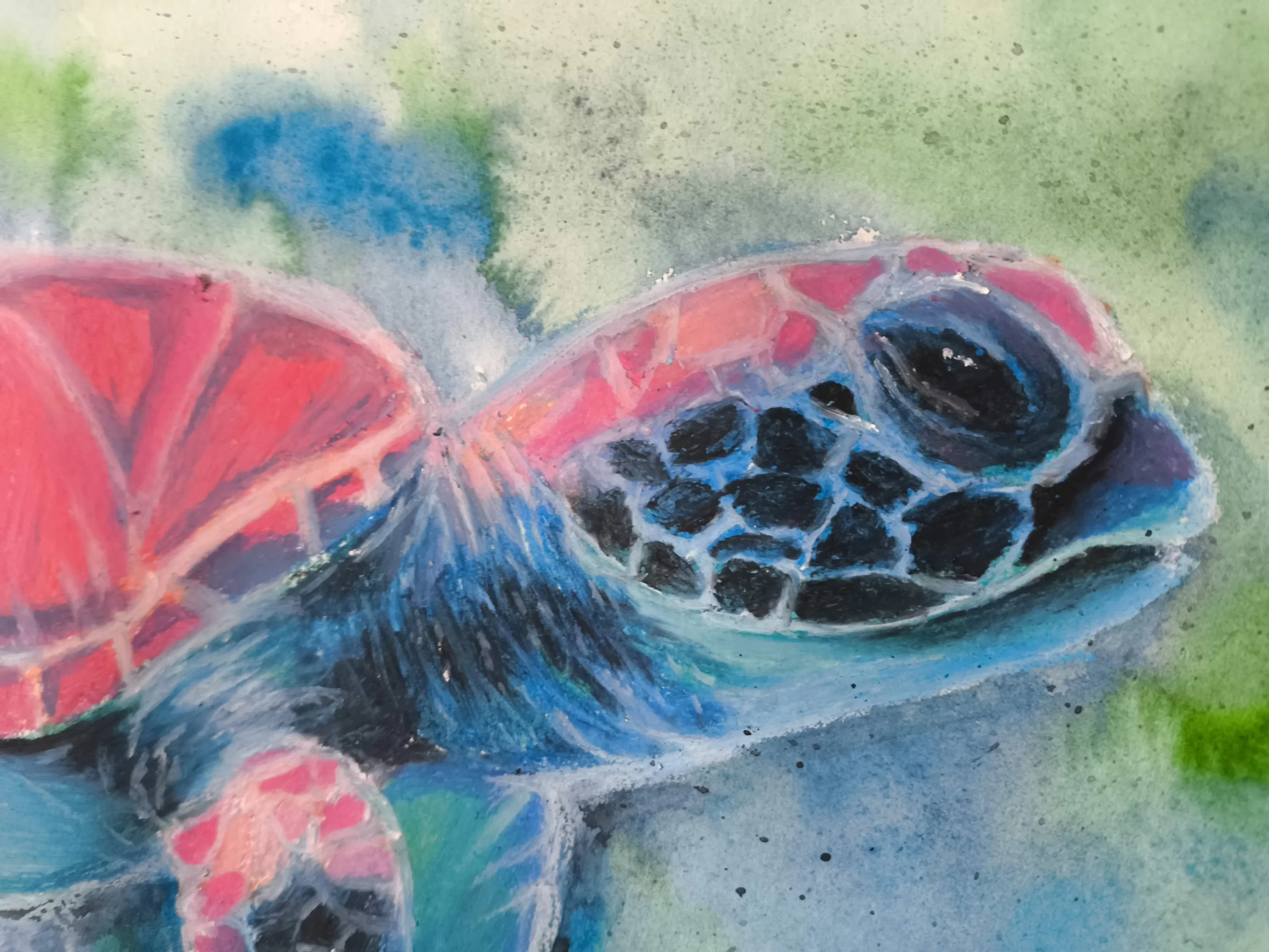 Colores vibrantes y transparencias que capturan la esencia viva de los arrecifes. Esta tortuga emerge de la oscuridad, guiada por la luz y el deseo de encontrar un rincón más cálido y acogedor para descansar. La fusión de acuarela y óleo pastel sobre papel crea una danza entre la suavidad del agua y la intensidad del color, reflejando la magia de los océanos en cada pincelada. Un recordatorio de la belleza y el movimiento constante de la vida marina.