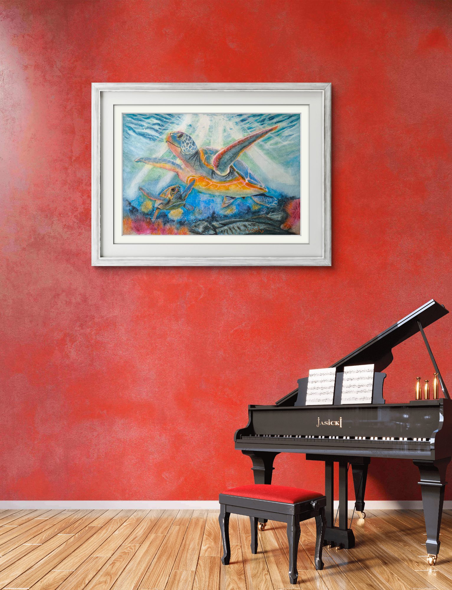 La obra evoca el lazo esencial entre madre e hija, sin palabras ni gestos humanos, solo a través del movimiento compartido y la cercanía entre ambas figuras. Es un retrato de amor en su forma más simple y natural, donde el entorno mismo —el sol, el mar, el coral— parece acompañar y proteger ese vínculo. Una imagen que invita a contemplar la belleza de la familia en su forma más orgánica y silenciosa.»