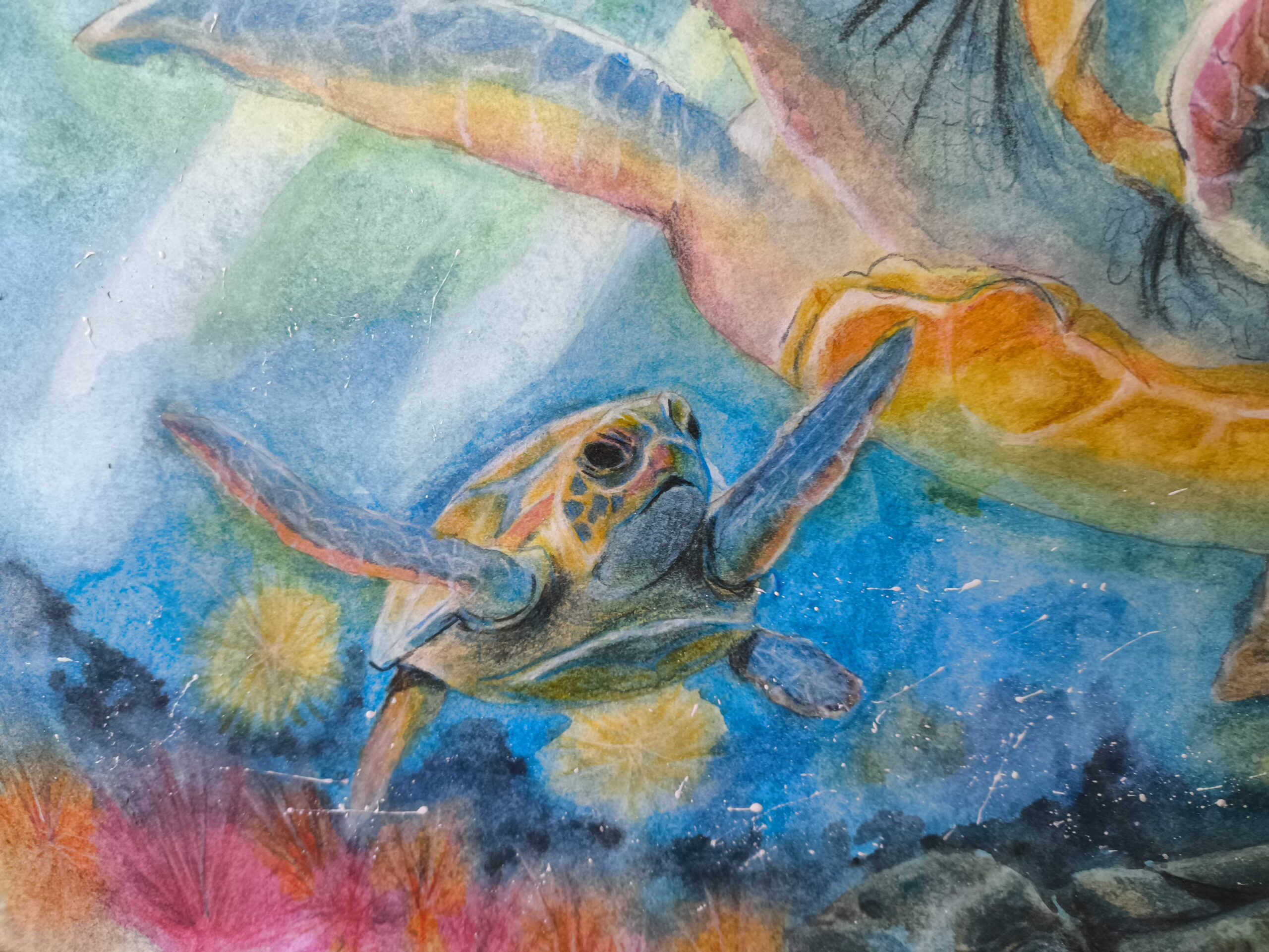 «En las aguas cristalinas de un arrecife poco profundo, una madre y su cría se desplazan con suavidad. Son tortugas, envueltas en una danza serena entre los corales cálidos y la luz solar que se filtra desde la superficie. El azul del mar abraza la escena, mientras los destellos dorados y naranjas del fondo marino aportan una calidez que trasciende lo visual: es una atmósfera de cuidado y compañía.